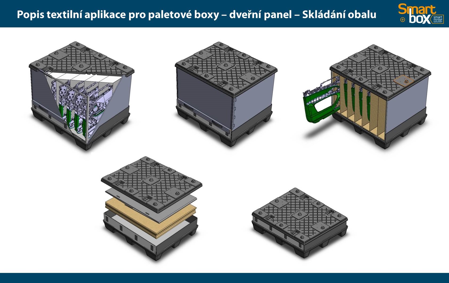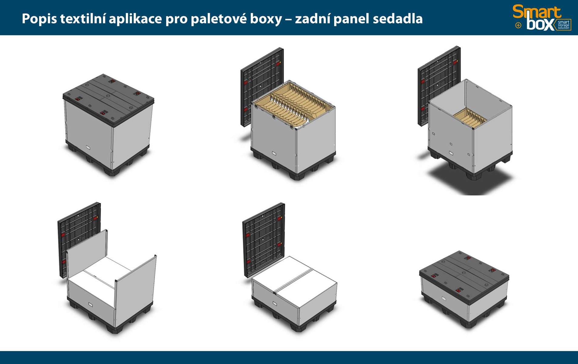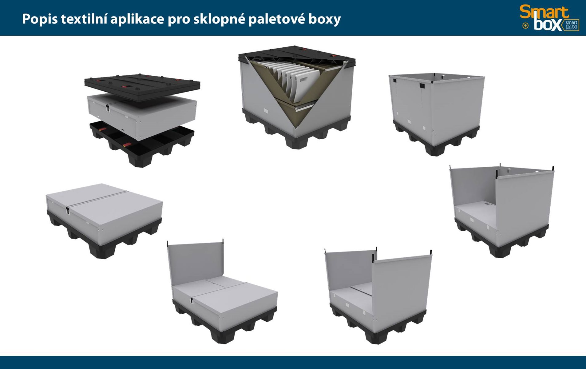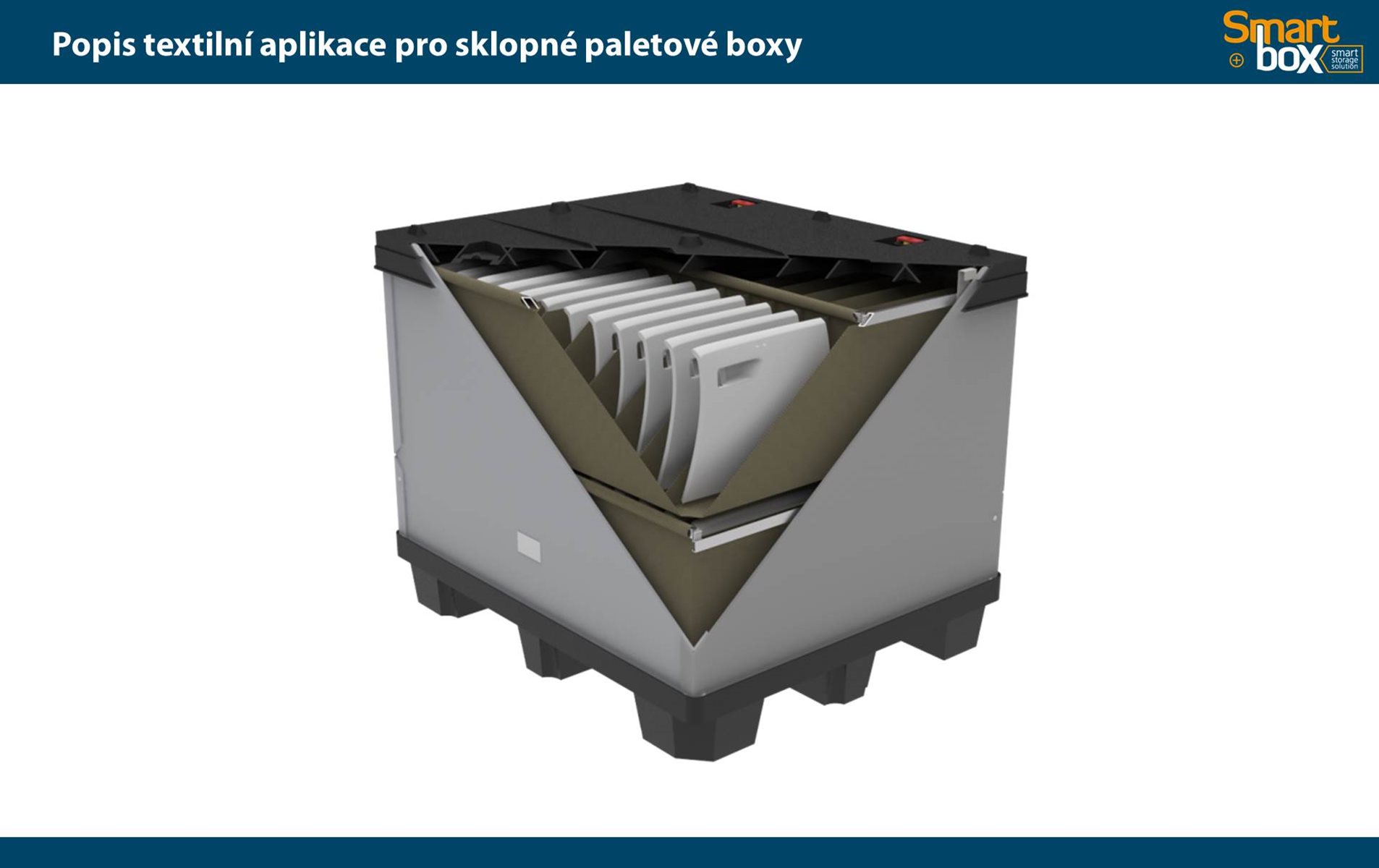 Tento typ kontejneru se vyznačuje velkým užitkovým objemem, který zaručuje maximální využití vnitřního objemu a zároveň minimální velikost boxu ve složeném stavu. Skládací paletový kontejner je ideální na manipulaci a skladování, zejména pak pro systém vratného balení. Možnost použití 2 a více pater textilních inzertů v jednom boxu.