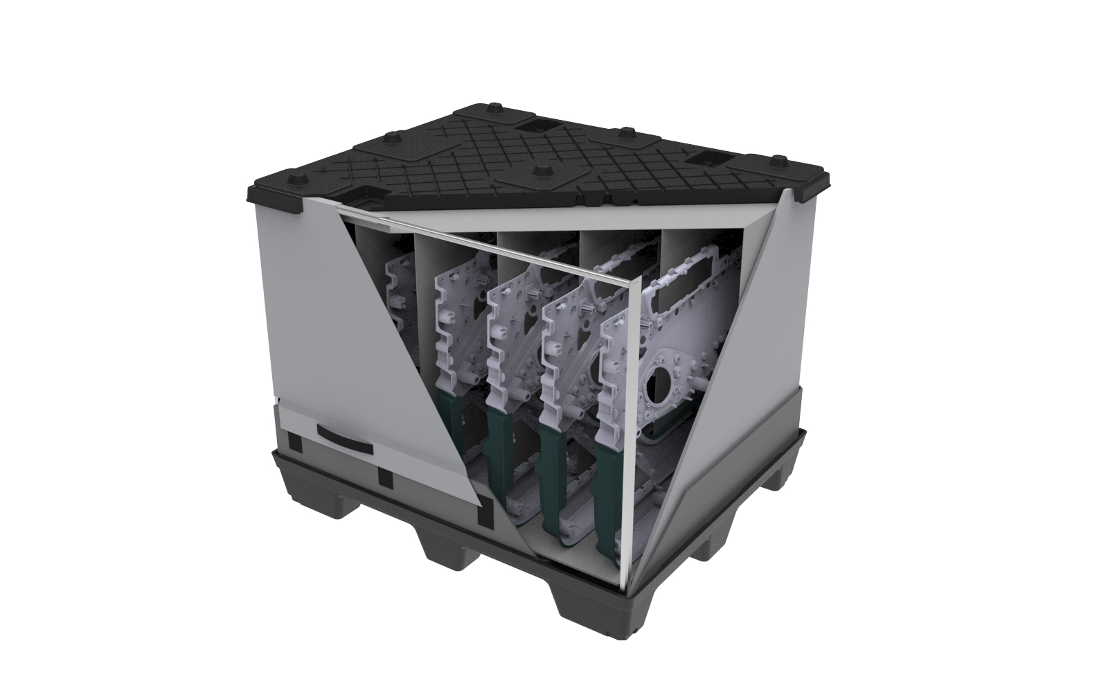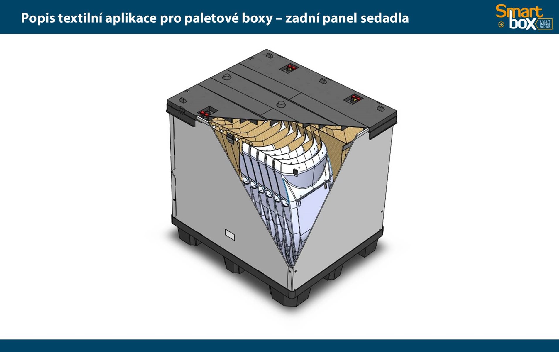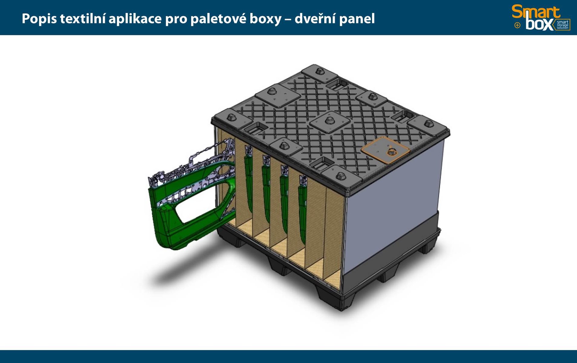 Tento typ kontejneru se vyznačuje velkým užitkovým objemem, který zaručuje maximální využití vnitřního objemu a zároveň minimální velikost boxu ve složeném stavu. Skládací paletový kontejner je ideální na manipulaci a skladování, zejména pak pro systém vratného balení. Možnost použití 2 a více pater textilních inzertů v jednom boxu.