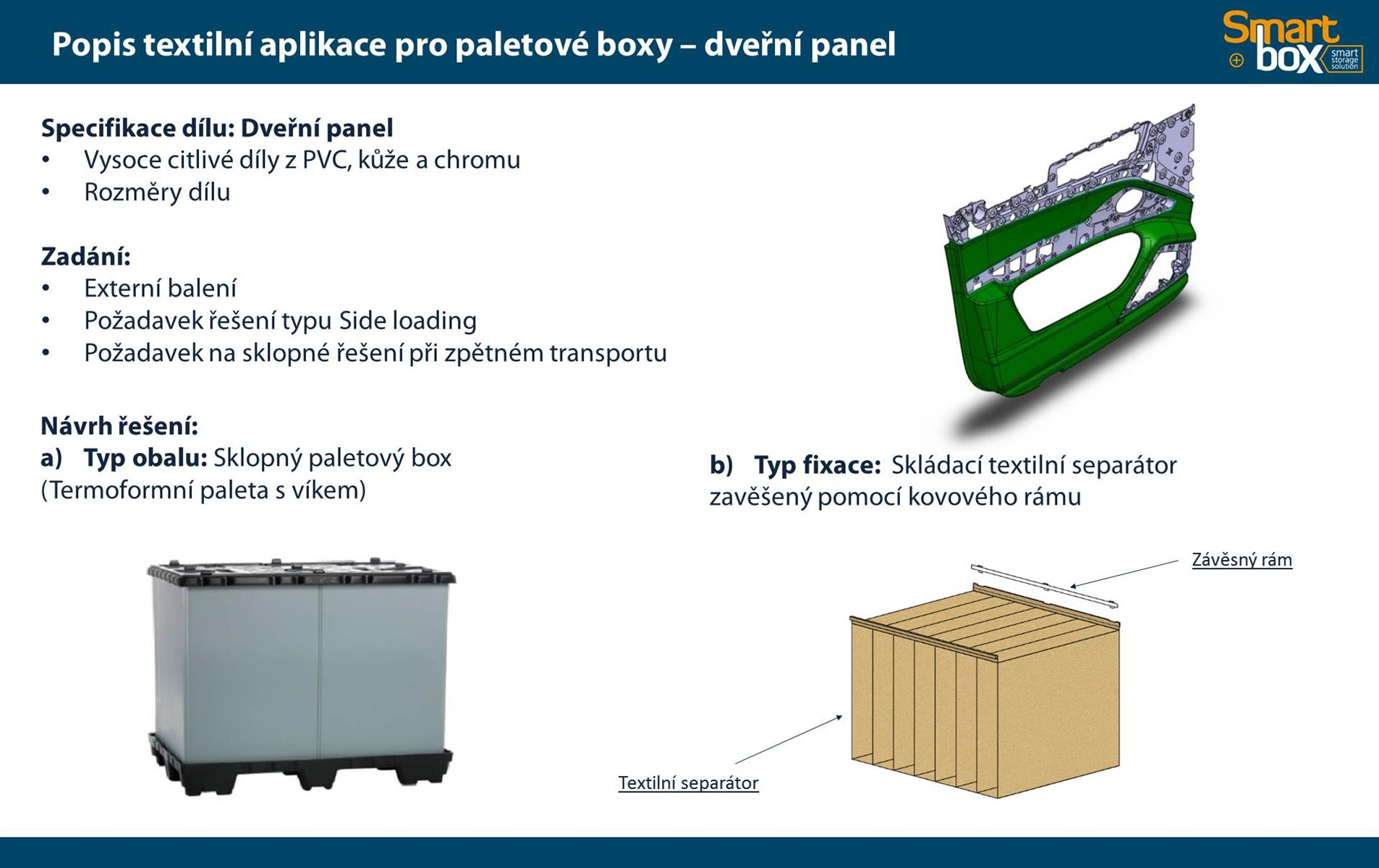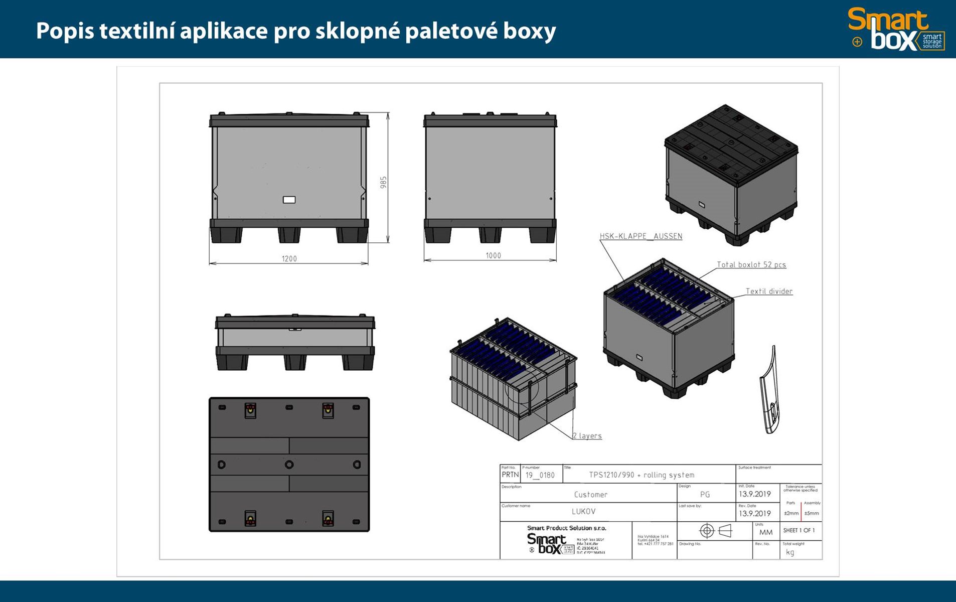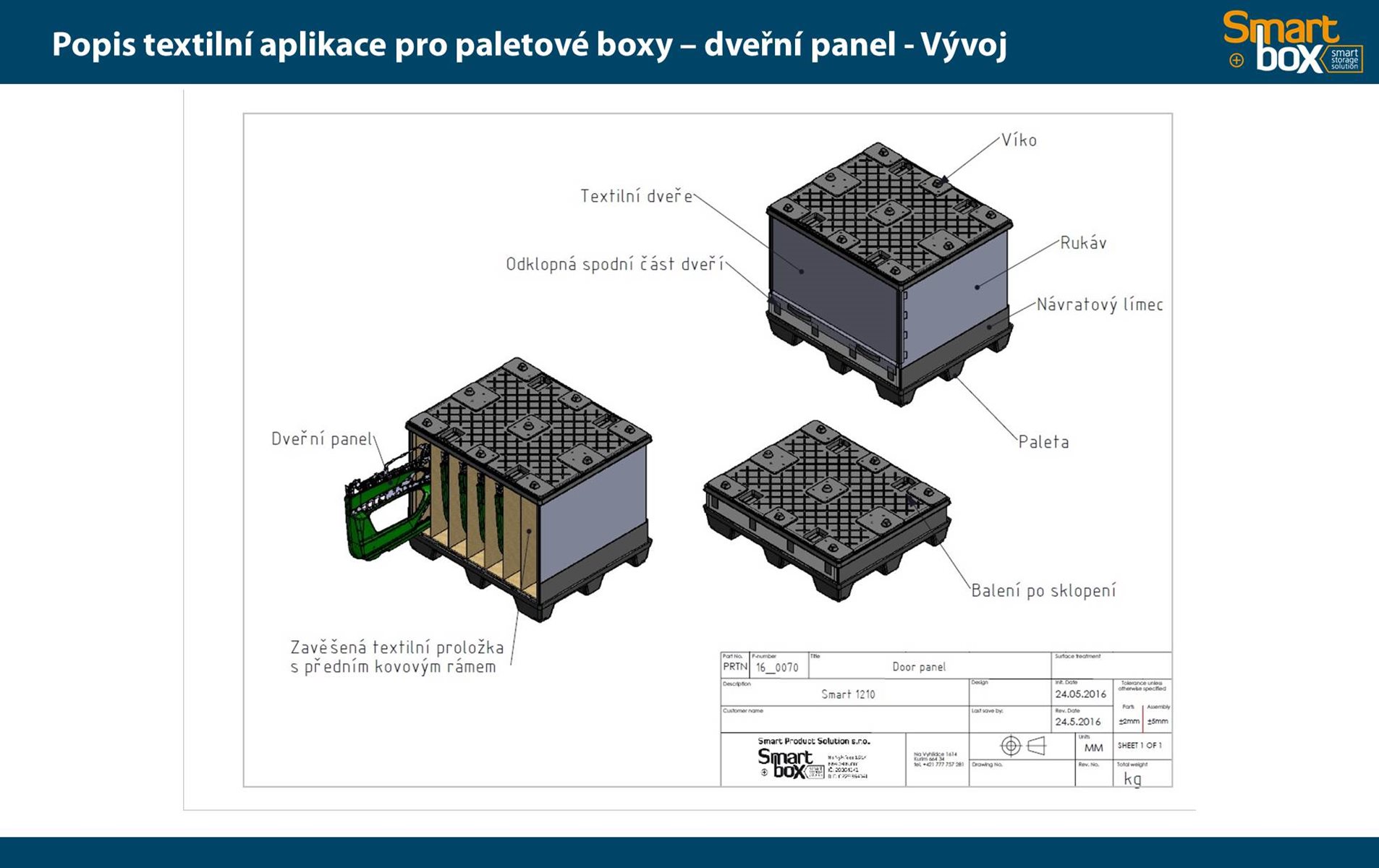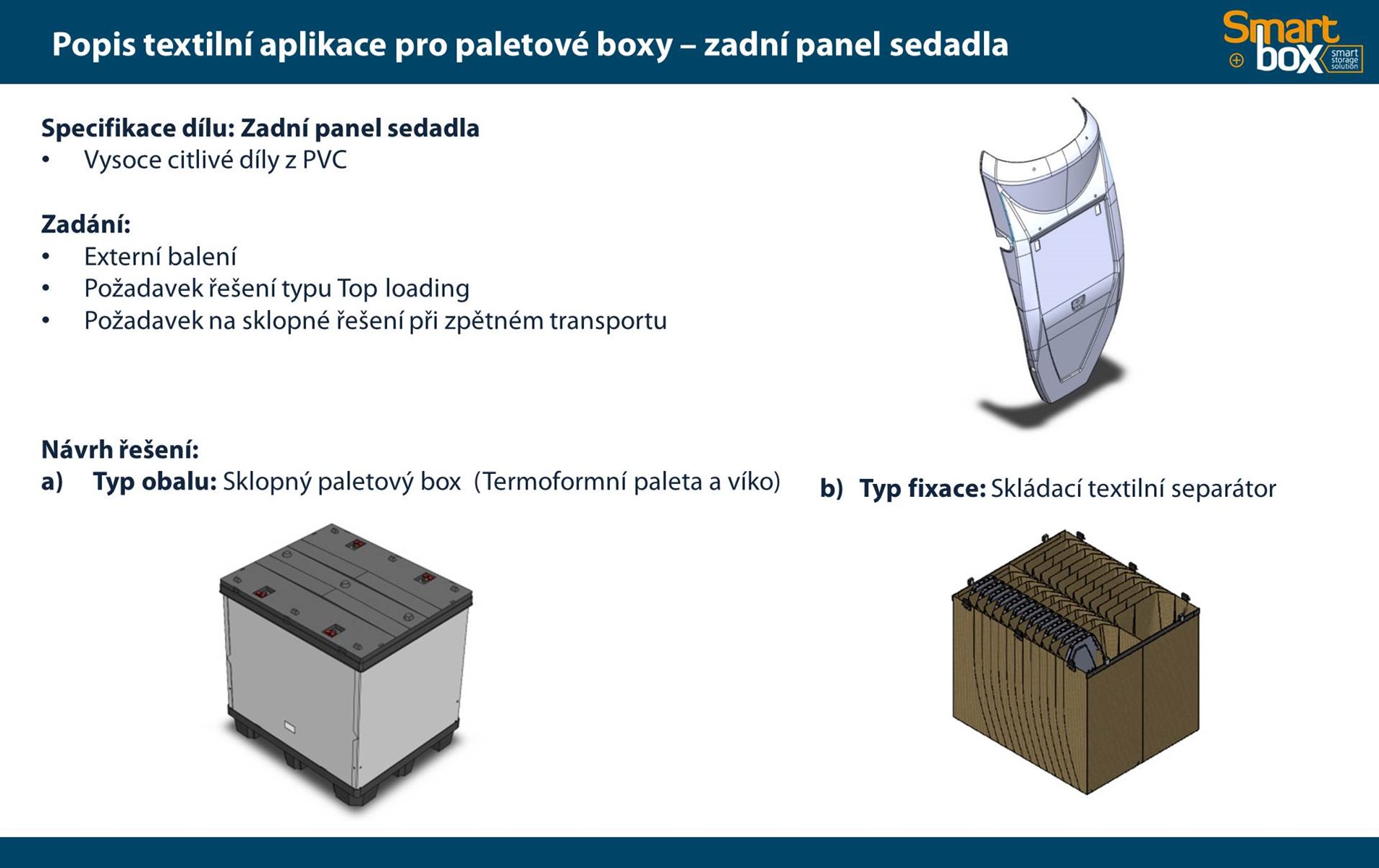 Tento typ kontejneru se vyznačuje velkým užitkovým objemem, který zaručuje maximální využití vnitřního objemu a zároveň minimální velikost boxu ve složeném stavu. Skládací paletový kontejner je ideální na manipulaci a skladování, zejména pak pro systém vratného balení. Možnost použití 2 a více pater textilních inzertů v jednom boxu.