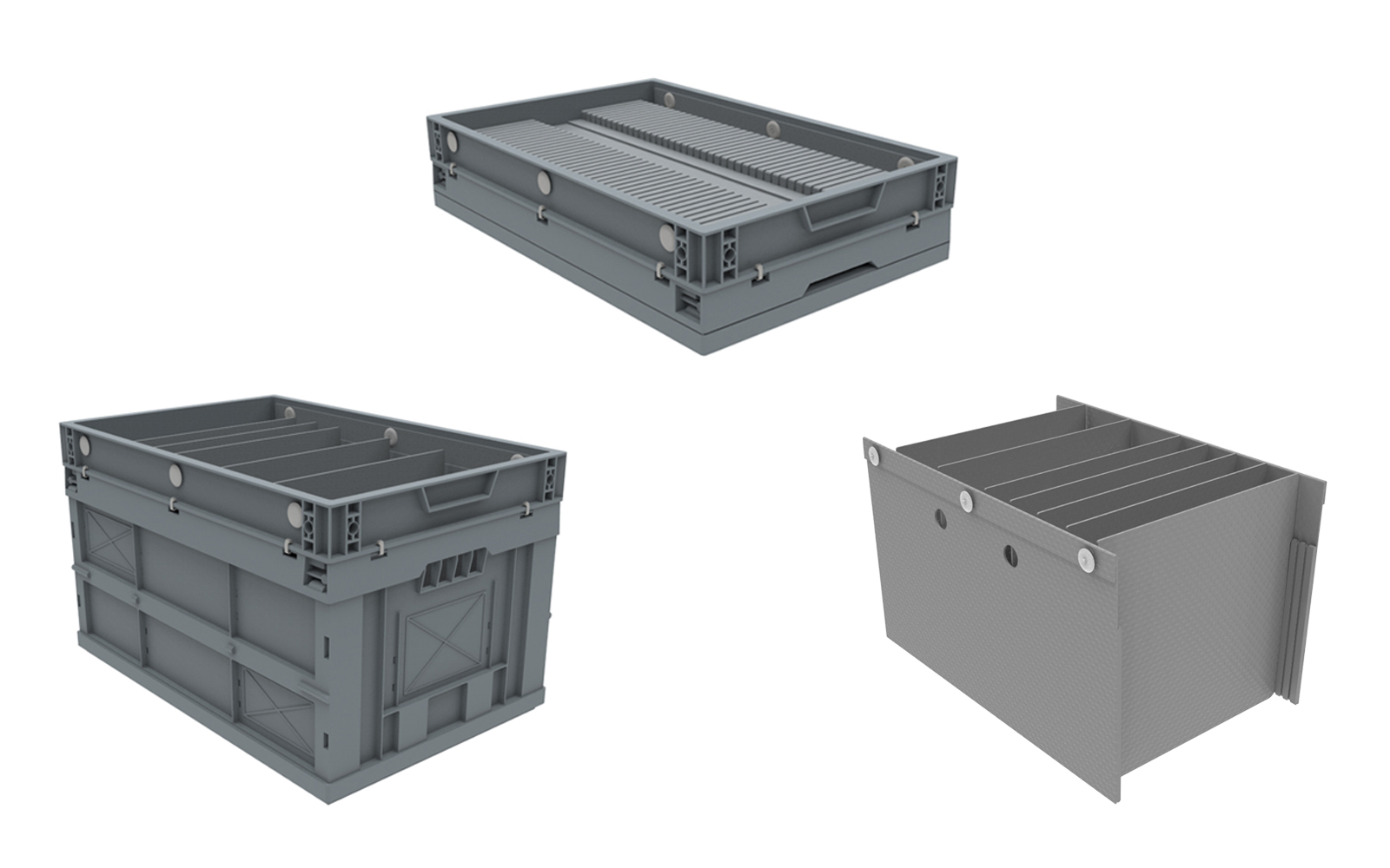 Prázdnou přepravku s příčkami můžete snadno složit. Přepravku je možné stabilně stohovat, a to i ve složeném stavu.