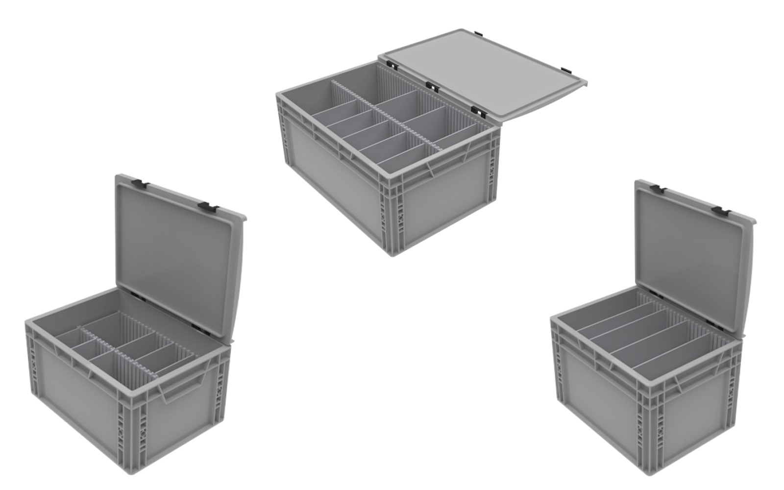 Euro box s vkládacími příčkami a víkem má univerzální užití ve všech průmyslových sektorech. Hlavní výhodou těchto boxů s vkládacími příčkami je libovolné nastavení velikosti buněk pomocí hřebenů a příček dle aktuální potřeby zákazníka. Je jednoduše stohovatelný, s využitím pro skladování i dopravu.